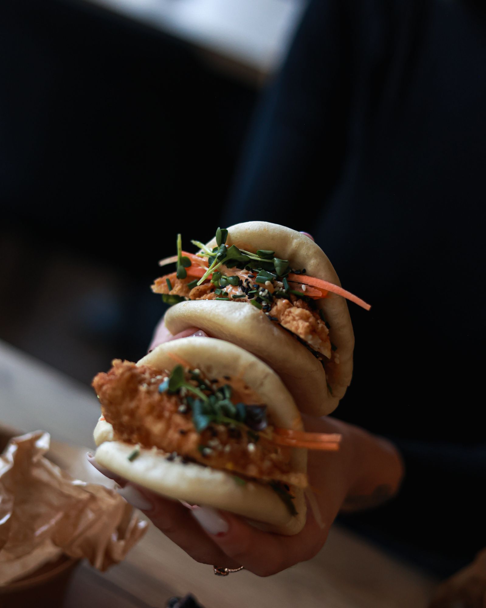 Mini burgery z szarpaną wieprzowiną, konfiturą z czerwonej cebuli i sosem chili mayo (4 szt.)